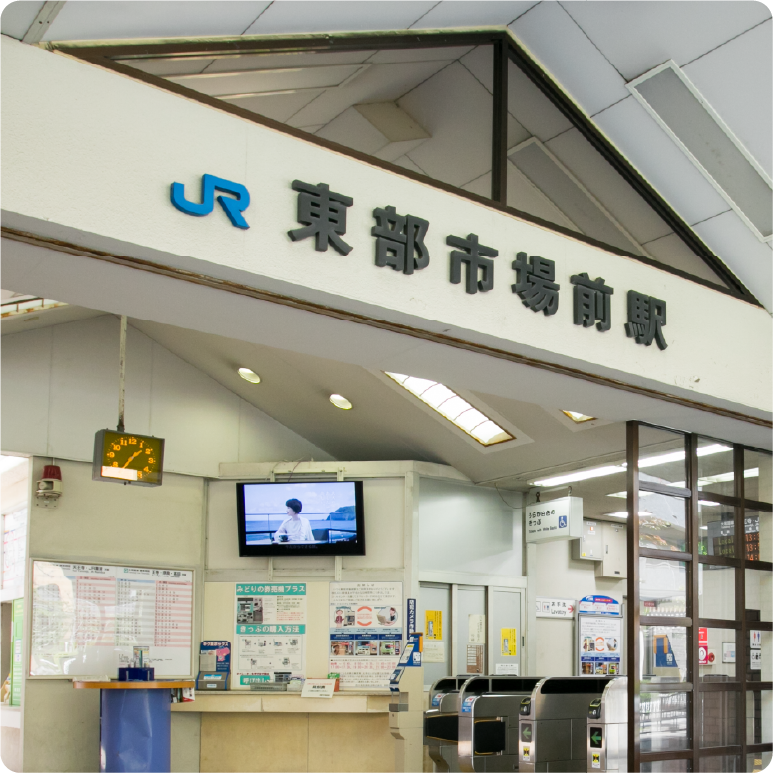関西本線(大和路線)の東部市場前駅から徒歩1分。改札口を出て左斜め後ろ方向に歩いてください。